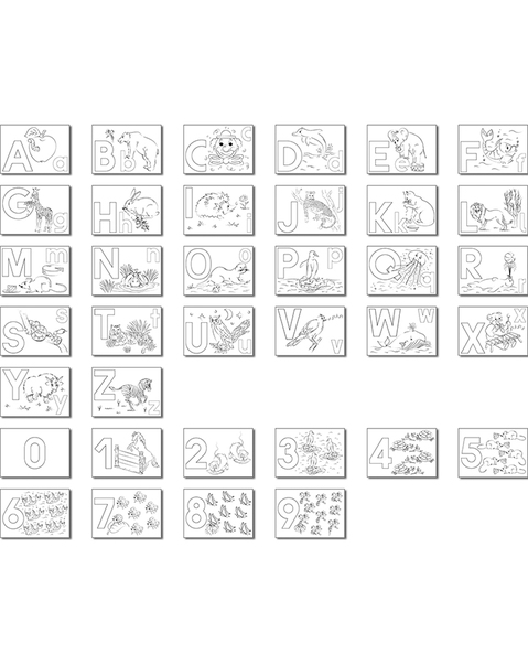 aus weissem Tonzeichenpapier 120 g/m² in DIN A6. Auf 36 Blättern finden sich Zahlen, Buchstaben und viele Tiere, die nur darauf warten mit Stiften und Bastelutensilien verschönert zu werden. Kinder ab 3 Jahren trainieren dabei das exakte Ausmalen und wenden ihre Kreativität an. Zudem werden das Zahlen- und Buchstabenverständnis geschult. Die fertig gemalten Motive können anschliessend in bunt herausgetrennt, verschenkt oder aufgehängt werden.