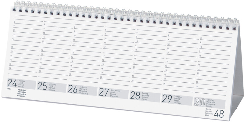 1 Woche auf 2 Seiten, Kalendarium viersprachig d/f/i/gb, querliniert, Vorderseite mit Stunden-Einteilung (08.00 – 18.00 Uhr), Rückseite für Notizen, zusätzliche Jahres-, Monats- und Adressseiten, Doppelseite mit 4-Monats-Übersicht, mit Kartonsteller, Wire-O-Bindung, Format: 29,8 x 11,7 cm. Nachhaltigkeit eco:plus: Zertifikat: FSC.