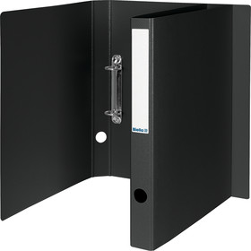 aus recyceltem, farbigem Graukarton 0,95 mm, aufgeklebtes Papier-Rückenschild, 2-Ring-Mechanik, Ø 25 mm. Für Format A4, mit Griffloch