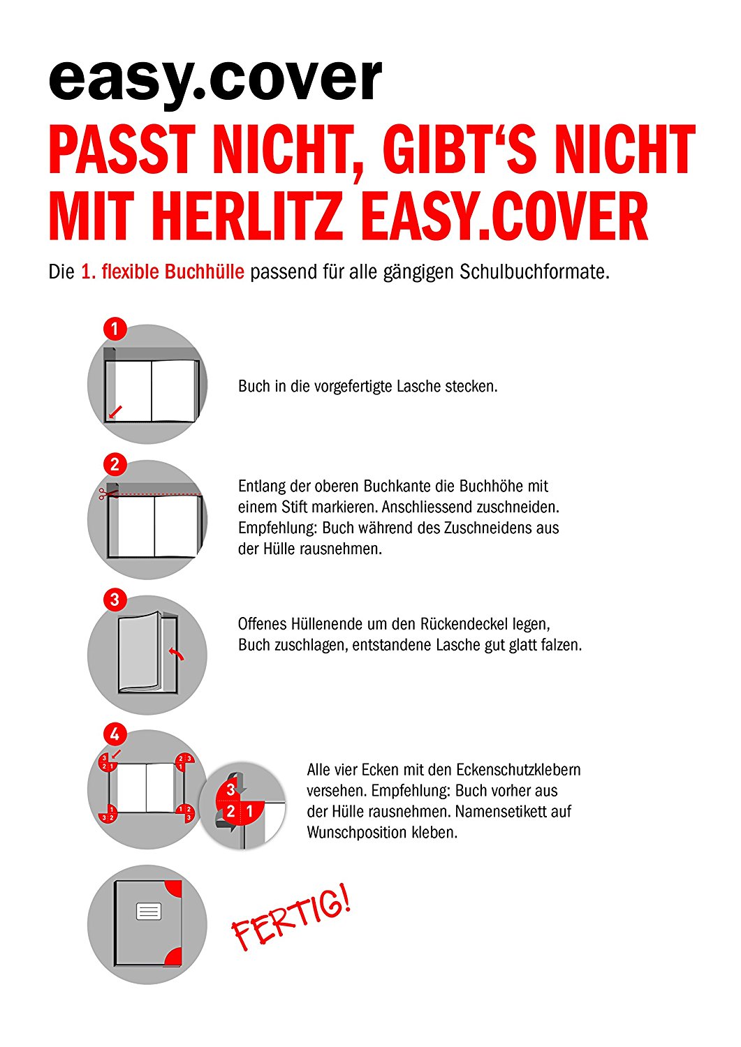 aus PP, flexibel glasklar transparent, in Höhe und Breite anpassbar,passt für alle gängigen Buchformate (max. 335 x 540 mm),hält ohne Klebstoff, inkl. Eckenschutz und Namensetiketten.