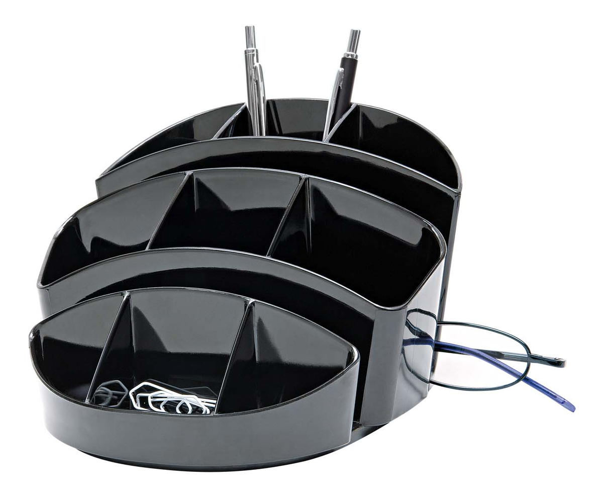 Aus Polystyrol gefertigt, mit 9 Fächern für Stifte und Utensilien, einer Briefablage und einem Zettelfach. Gummifüße sorgen für einen rutschsicheren Stand und sind zugleich möbelschonend.Maße: ca. 15,0 x 13,5 x 9,0 cm