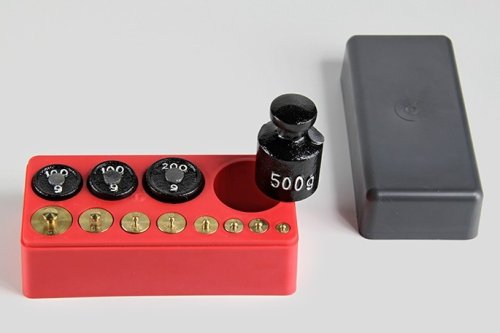Gussgewichte: 1 x 500 g, 1 x 200 g, 2 x 100 g, 1 x 500 g Messinggewichte: 1 x 50 g, 1 x 20 g, 2 x 10 g, 1 x 5 g