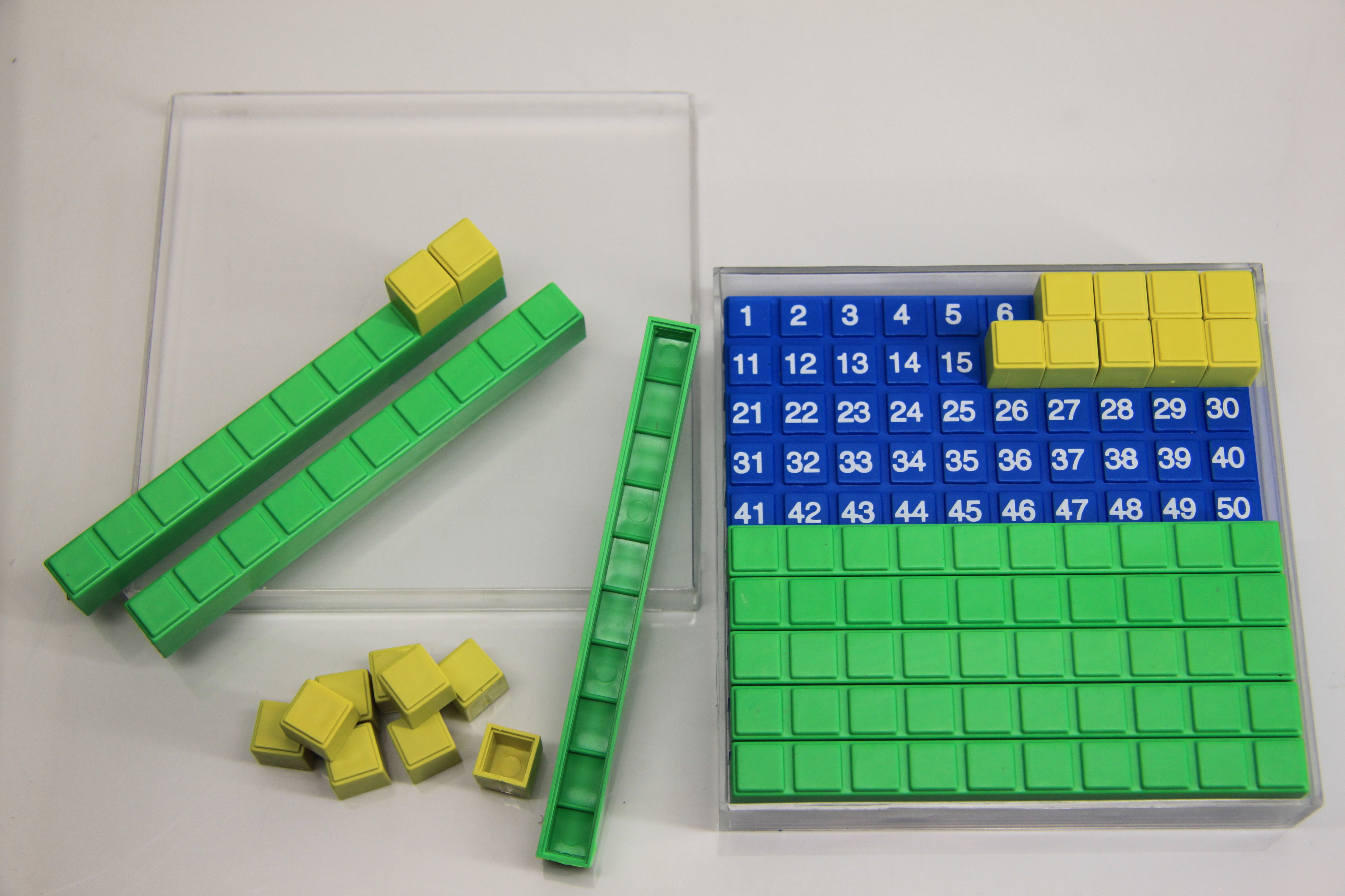 Dezimal Zehnersystem veranschaulicht das Rechnen im Zahlenraum bis Hundert. Mit diesen 20 Teilen kann der Hunderterraum gut dargestellt und spielerisch geübt werden. Die Platte ist mit Zahlen bedruckt.