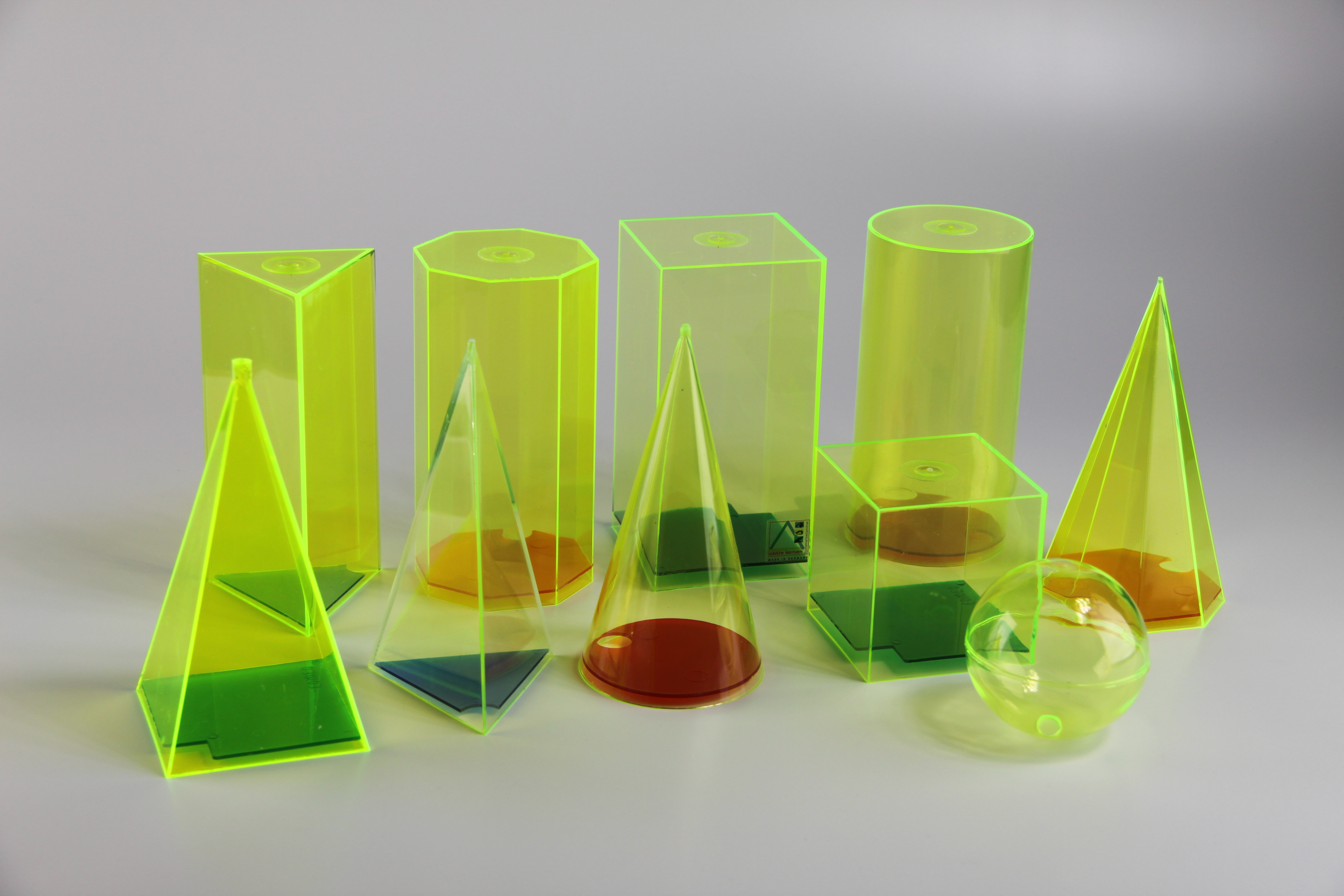 Mit diesem Körpersatz aus 10 verschiedenen Formen kann man nicht nur verschiedene geometrische Begriffe erkennen, sondern auch Volumenvergleiche durch Befüllen aufzeigen. Höhe zu Basis = 2/1! (15 cm : 7,5 cm).