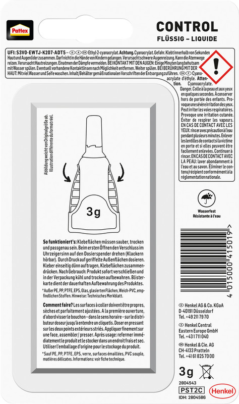 universeller Sekundenkleber für alle Sofortreparaturenklebt fast alle Materialiennicht geeignet für GlasPE und PPklebt sofortfliesst in kleinste Ecken und Spaltenwasser- und spülmaschinenfeststossfester Dosierspender mit feinster Dosierspitzepräzises und kontrolliertes Auftragenmit integriertem Auslaufschutzlösungsmittelfrei.