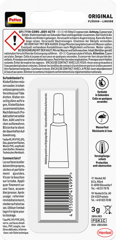 universeller Sekundenkleber für alle Sofortreparaturenklebt fast alle Materialiennicht geeignet für GlasPE und PPklebt sofortwasser- und spülmaschinenfestTubenverschluss mit Nadelkeine verklebte Spitzelösungsmittelfrei.