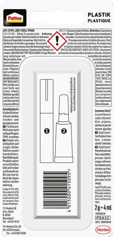 universeller Sekundenkleber für alle Sofortreparaturen, klebt alle Kunststoffe, wird in 2 Teilen per Aktivator-Stift und Klebstoff-Tube aufgetragen, klebt sofort, Tubenverschluss mit Nadel, keine verklebte Spitze.