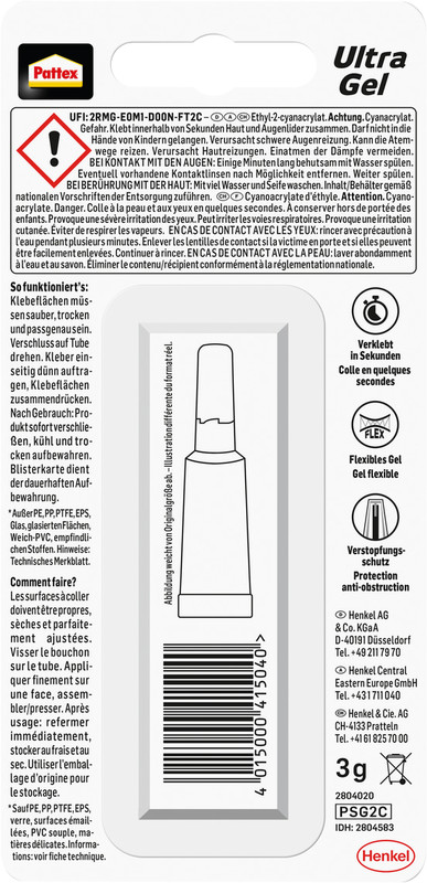 flexibler Sekundenkleber dank Micro-Gummipartikel, tropft nicht, universell, gelförmig, klebt fast alle Materialien, nicht geeignet für Glas, PE und PP, kurz korrigierbar, schlag- und wasserfest, bruchsicher, vibrationsdämpfend, Tubenverschluss mit Nadel, keine verklebte Spitze, lösungsmittelfrei.