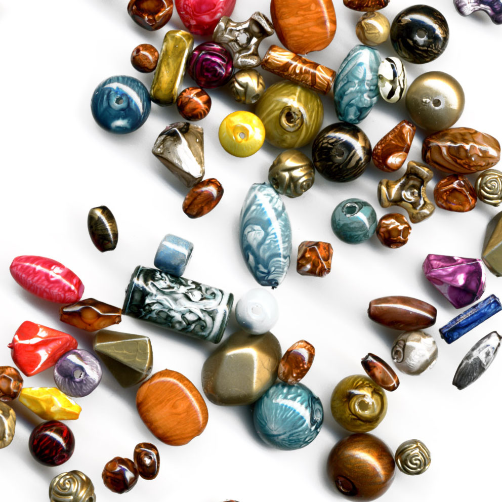 Bunte Kunststoffperlen mit Loch, verschiedene Grössen, Formen und Farben.