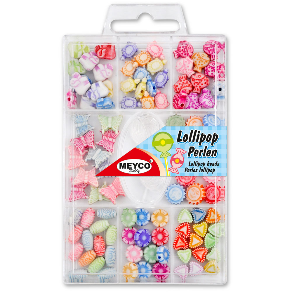 Bunte Lollipop Perlen, 17 Gramm, farblich sortiert, mit Elastikschnur. Diese bunten Kunststoffperlen in verschiedenen Formen und Größen sind ideal zum Basteln hübscher Perlenketten.