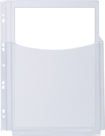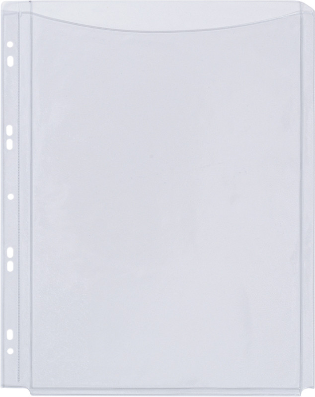 aus PVC 180 Micron, transparente, extrastarke Folie, aufgeschweisste Tasche mit Seitenfalz, Universallochung, Füllhöhe bis 20 mm.
