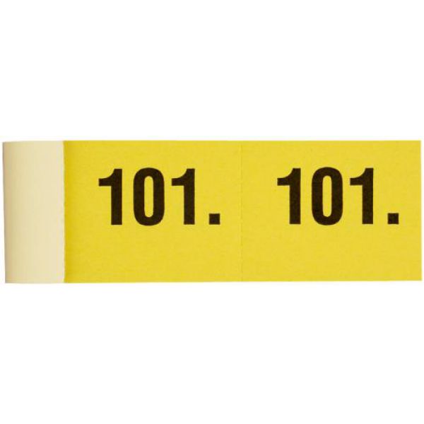 fortlaufende Doppel-Nummeration in schwarz, 2 Perforationen für einfaches Abreissen, Deckblatt mit Leinwandfalz, Format 115 x 40 mm. Block zu 100 Blatt