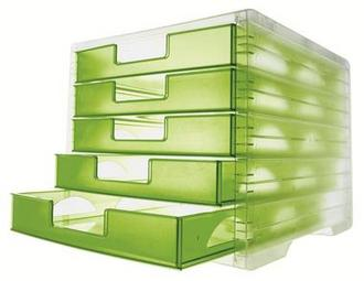 aus schlagfestem PS, mit 5 geschlossenen Schubladen, leicht stapelbar, Auszugsstopp, Gehäuse transparent/transluzent, für Format A4/C4.Aussenmasse: B 270 x H 255 x T 340 mm.