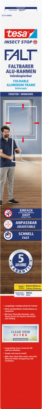 faltbarer Rahmen aus langlebigem Aluminium, bietet Schutz vor Insekten auch bei geöffneten Fenstern, einfaches Anbringen ohne Werkzeug, durch flexible Grösseneinstellung von B 80 x H 80 cm bis B 140 x H 140 cm für fast alle Standard Fenster geeignet, mit Bürstendichtung zum Schutz vor kleinen und grossen Krabbeltieren, hohe UV-Beständigkeit, mehrfach wiederverwendbar, waschbar bis 30°C. Garantie: 5 Jahre.